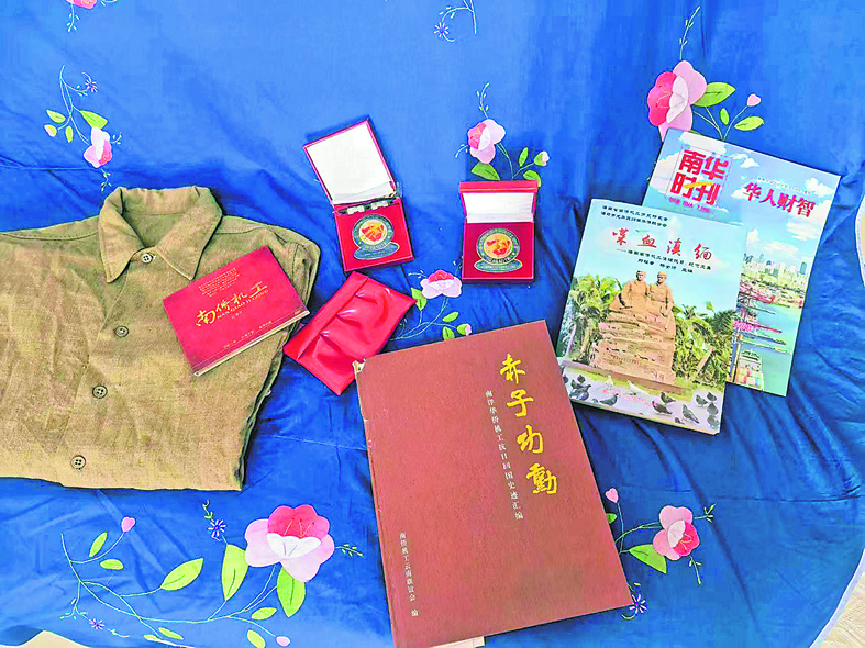 皮包之外,符桂英家中还有两枚“南洋华裔机工抗日回国服务六十周年”的纪念章。符桂英的爱人罗保章,同样是南侨机工后人。1939年,罗保章的父亲罗豫川与罗开瑚、罗豫江结伴,作为第八批南侨机工回国参战。
